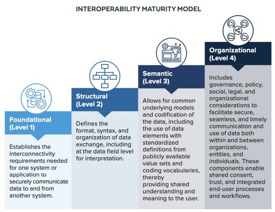 • Organizational: The highest level, aligns policies, governance, workflows, legal agreements, and incentives across organizations so data exchange can occur at scale and be sustained. This includes data governance models, consent management, trust frameworks, and operational processes.